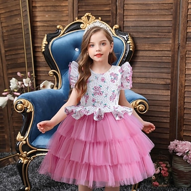 Děti Dívčí Šaty na párty Pevná barva Krátký rukáv Výkon Flitry Princeznovské Směs bavlny Polyester Midi Léto Jaro Podzim Děti Vodní modrá Fazolový pastový prášek
