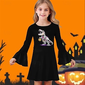 předvečer Všech svatých Girls ' 3D Dýně Dinosaurus Šaty Šaty s volánky Dlouhý rukáv Léto Jaro Dovolená Denní Krásná Sladký Děti 4-12 let Volnočasové šaty Délka ke kolenům Běžný