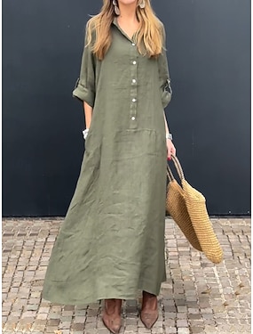 Dámské Maxi šaty Imitace bavlny a lnu Košilové šaty Volnočasové šaty Základní Na běžné nošení Denní Dovolená Běžný Bez vzoru Dlouhý rukáv Košilový límec Světlá růžová Trávová zelená Šedá Jaro Podzim