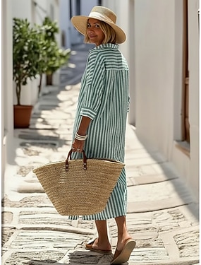 Dámské Midi šaty Imitace bavlny a lnu Bavlněné plátěné šaty Módní Moderní Dovolená Jdeme ven Víkend Běžný Proužky Dlouhý rukáv Košilový límec Vodní modrá Žlutá Světle zelená Světlá růžová Léto Jaro