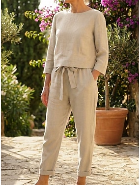 Dámské kalhoty z 15% lnu, základní, s kapsami, elastický pas, tričko, kalhoty pro každodenní nošení, dlouhý rukáv, kulatý výstřih, modrá, černá, bílá, tmavě modrá, světle hnědá, léto, jaro
