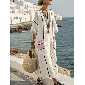 Dámské maxi šaty z flaxu jako prodyšná lehká A-linie šaty letní šaty pohodlné každodenní volný střih pruhované 3/4 délka rukávu V výstřih modrá bílá červená béžová léto jaro podzim