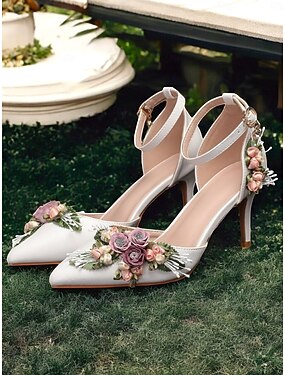 dámské bílé svatební lodičky s květinovým zdobením - elegantní špičatý design, pásek kolem kotníku a jehlový podpatek, ideální pro svatby a zvláštní příležitosti