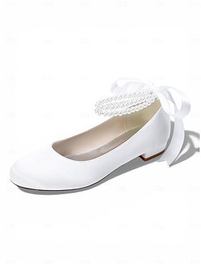 Dámské saténové svatební boty na nízkém podpatku s mašlí &organzový květ, perlové pásky na kotník pro nevěsty, elegantní pohodlné podpatky pro svatební obřad &recepce