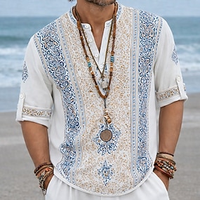 Pánské Geleneksel Složité květinové Košile Košile na knoflíky Tričko Henley Dlouhý rukáv Vintage Retro Ležérní Dovolená Svatební Léto Jaro Stojáčkový límec Stojáček 3D tisk Len jako košile Bíl