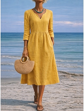 Dámské Midi šaty Imitace bavlny a lnu Áčkové šaty Na běžné nošení Denní Běžný Bez vzoru 3/4 délka rukávu Do V Vodní modrá Žlutá Světlá růžová Rubínově červená Léto Jaro Podzim