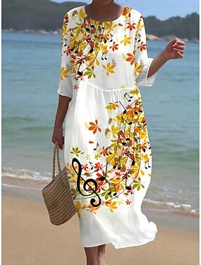 Dámské Midi šaty Imitace bavlny a lnu Úpletové šaty Volnočasové šaty Na běžné nošení Denní Běžný Květinový 3/4 délka rukávu Tričkový Bílá Oranžová Trávová zelená Léto Jaro