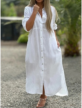 Dámské Maxi šaty Imitace bavlny a lnu Košilové šaty Bílé šaty Na běžné nošení Denní Víkend Volný Bez vzoru 3/4 délka rukávu Tričkový Vodní modrá Černá Bílá Rubínově červená Léto Jaro