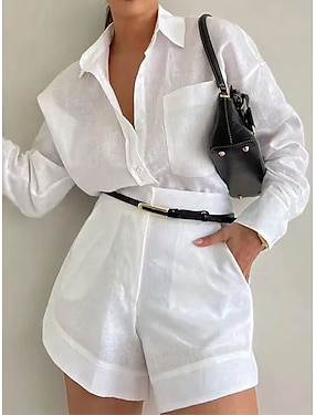 Dámské Košile Sady inspirované lnem Dvoudílné sady Pytlovité šortky Dlouhý rukáv Košilový límec Pevná barva Slátanina Denní Venkovní Vodní modrá Šedá fialová Bílá Jaro & podzim Běžný