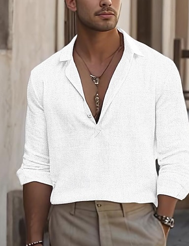 Pánské Košile Lněná košile Letní košile Plážová košile Pevná barva Dovolená Ležérní Černá Bílá Trávová zelená Dlouhý rukáv Do V Oblečení Šňůrky