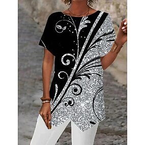 Dámská blůza asymetrický spodní lem základní abstraktní potisk krátký rukáv dlouhé topy kulatý výstřih casual stříbrná černá bílá modrá khaki