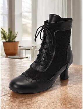 Dámské kotníkové boty ve viktoriánském stylu s krajkovým designem a akcenty z umělé kůže – vintage šněrovací obuv pro příležitostné i kostýmní příležitosti