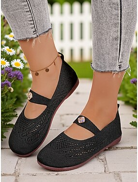 Dámské široké flyknit mary jane balerínky – prodyšné pohodlné boty s kamínkovým páskem pro chůzi i každodenní nošení