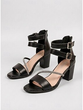 Dámské černé sandály s kamínky na kotníku - třpytivé sandály s otevřenou špičkou, stylové a pohodlné sandály pro každodenní nošení