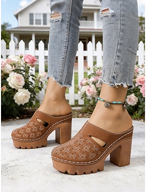 Dámské hnědé pantofle na platformě s výřezem na podpatku – letní boty na robustním podpatku pro volnočasové aktivity, zahradní párty a každodenní nošení