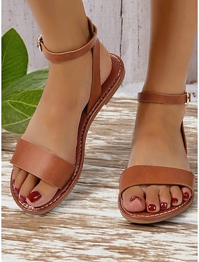 dámské hnědé sandály z umělé kůže s otevřenou špičkou – ležérní ploché kalhoty s kamínkovou přezkou na léto a každodenní nošení