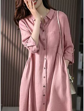 Dámské Midi šaty Volnočasové šaty Bavlněné plátěné šaty Áčkové šaty Základní Na běžné nošení Dovolená Denní Běžný Bez vzoru 3/4 délka rukávu Košilový límec Světlá růžová Trávová zelená Léto Jaro