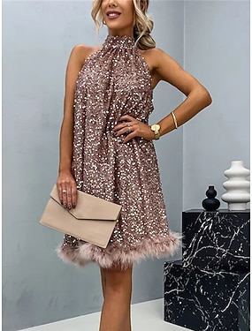 Dámské Flitrové šaty Šaty na párty Péřové šaty Flitry Jiskřivý Krk ohlávky Bez rukávů Mini šaty Zimní šaty Svatební host Černá Světlá růžová Jaro Zima
