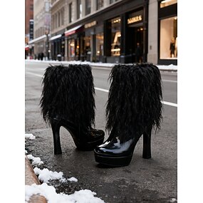 Dámské černé kotníkové boty na šněrování z umělé kožešiny s robustními podpatky – teplé zimní sněhule na vánoční trhy, do volného času i do moderního streetwearu