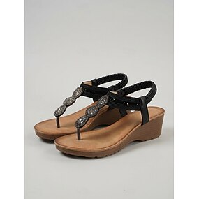 Dámské černé bohémské sandály s kamínky - pohodlné žabky na klínku s flitrovanými pásky na dovolenou na pláži, letní plavby &venkovní resorty