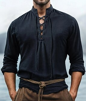 Pánské Košile Vikingský styl Letní košile Oblečení na pláž Pirátská košile Pevná barva Dovolená ulice Černá Námořnická modř Khaki Dlouhý rukáv Stojáček Léto Jaro Oblečení Šňůrky