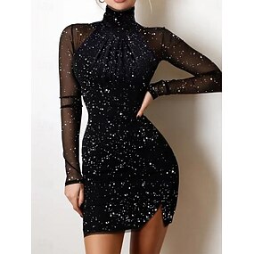 Dámské Mini šaty Plášťové šaty Elegantní Večírek koktejl Venkovní Párty Svatební host Slátanina Třpytivý tyl Běžný Pevná barva Dlouhý rukáv Rolák Černá