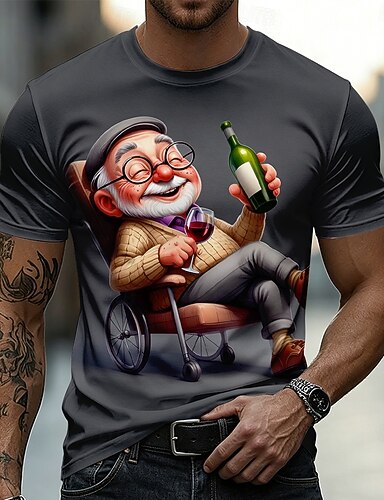 Pánský šťastný starý muž pije víno na invalidním vozíku 3D kreslená grafika vtipný humor tričko grafický kulatý výstřih krátký rukáv odchod do důchodu dárek pro dědečka milovník vína značkové oblečení