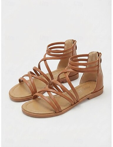 Dámské vícepáskové gladiátorské sandály - pohodlné boho ploché sandály se zapínáním na zip vzadu &tenké popruhy pro dovolenou v resortu, letní plavby &oblečení pro moře