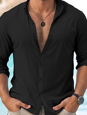 Pánské Košile Lněná košile Letní košile Plážová košile Bavlněná lněná košile Bez vzoru Dovolená Běžné / Denní Černá Bílá Světle zelená Tmavě námořnická Dlouhý rukáv Stojáček Jaro & podzim Oblečení