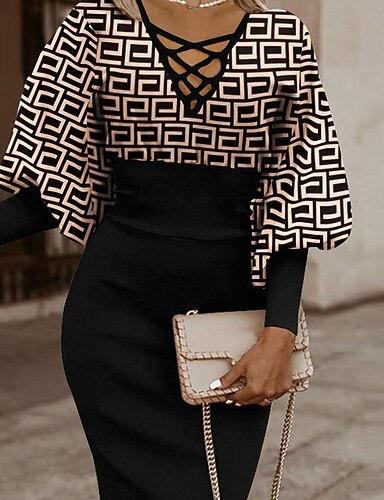 Dámské Midi šaty Volnočasové šaty Šaty s potiskem Elegantní Módní Moderní Denní Párty Jdeme ven Běžný Grafika Barevné bloky Dlouhý rukáv Do V Černobílá Černá Bílá Rubínově červená Zima Podzim