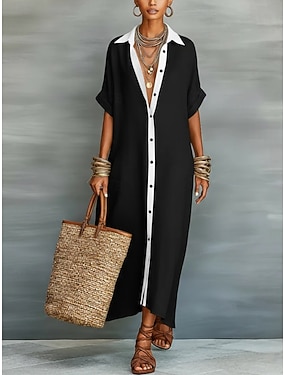 Dámské Midi šaty Imitace bavlny a lnu Košilové šaty Kaftanové šaty Módní Moderní Denní Venkovní Dovolená Běžný Bez vzoru Krátký rukáv Košilový límec Vodní modrá Černá Bílá Žlutá Léto Jaro