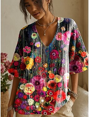 Dámské Tričko Tisk Květinový Grafika Geometrický Vinobraní stylové Na běžné nošení Krátký rukáv Do V Dlouhé topy Ležérní Denní Víkend Vodní modrá Černá Rubínově červená Léto Jaro