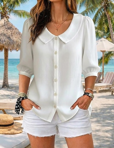 Dámské Halenka Košile z imitace lnu Knoflíky Pevná barva Vinobraní stylové Na běžné nošení Poloviční rukáv Košilový límec Běžné topy Denní Vodní modrá Černá Bílá Světlá růžová Trávová zelená Léto
