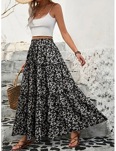 Dámské Dovolená sukně Módní Na běžné nošení Maxi Vysoký pas Sukně Květiny Nabírané šaty Tisk Lehce elastické Denní ulice Vodní modrá Černá Bílá Léto Polyester