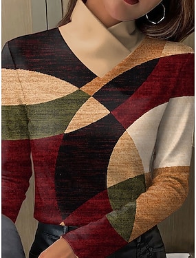Dámské Trička Tisk Vrstvené Grafika Geometrický Elegantní Vinobraní Módní Dlouhý rukáv Nabíraný krk Běžné topy Denní Jdeme ven Víkend Vodní modrá Světlá růžová Rubínově červená Hnědá Trávová zelená