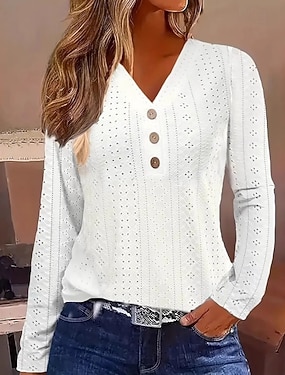 Dámské Tričko Očko nahoře Tričko Top Knoflíky Bez vzoru Módní Klasické Na běžné nošení Dlouhý rukáv Do V Běžné topy Denní Jdeme ven Víkend Bílá Žlutá Světlá růžová Nebeská modř Léto Jaro