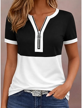Dámské Tričko Zip Čtvrtletní zip Grafika Geometrický Barevné bloky Tropický vzhled Havajské stylové Krátký rukáv Tričkový Do V Běžné topy Denní Sport Jdeme ven Černobílá Černá Duhová Léto Jaro