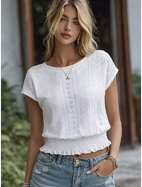 Dámské Texturovaná halenka Očko nahoře Tričko s motivem Pointelle Halenka Nabírané šaty Bez vzoru Aktivní Na běžné nošení Krátký rukáv Do V Běžné topy Ležérní Denní Venkovní Růžová růžová Černá Bíl