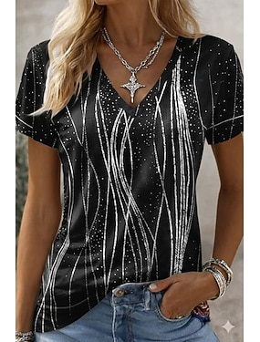 Dámské tričko s potiskem, vtipné, s citáty, grafické, abstraktní, vintage, stylové, ležérní, krátký rukáv, výstřih do V, běžné tílko, denní, na víkend, stříbrná, černá / stříbrná, černá + modrá, léto,