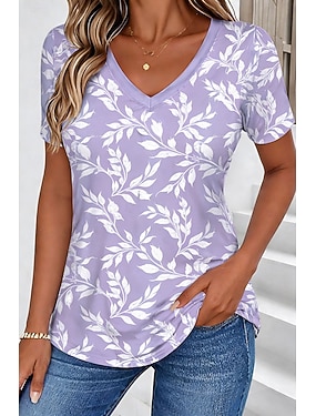 Dámské Tričko Tisk Květinový Grafika Rostliny stylové Klasické Na běžné nošení Krátký rukáv Do V Běžné topy Denní Fialová Oranžová Trávová zelená Šedá Léto Jaro