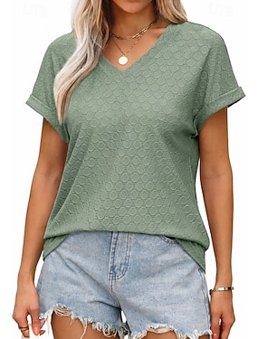 Dámské Trička s očkovanou výšívkou Rolovaná manžeta S texturou Pevná barva stylové Na běžné nošení Krátký rukáv Netopýří rukávy Do V Běžné topy Denní Jdeme ven Černá Bílá Prašná růže Trávová zelená