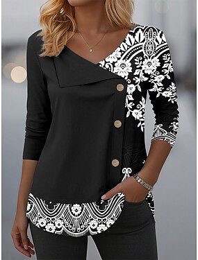 Dámská tunika blůza V výstřih dlouhý rukáv knoflíky grafické kmenové elegantní móda příležitostné kulatý výstřih pravidelné topy každodenní patchwork tisk černá růžová modrá fialová zelená jaro