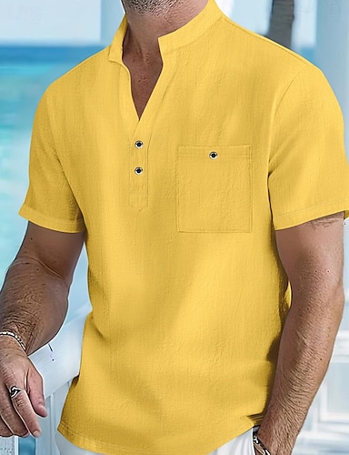 Pánské Košile Lněná košile Popover košile Košile pro volný čas Bavlněná košile Bez vzoru Dovolená ulice Bílá Žlutá Růžová Meruňková Krátký rukáv Kulatý límeček Léto Oblečení Kapsy