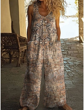 Dámský overal s imitací bavlny a lnu, normální velikost, aktivní, květinový, bez rukávů, široké nohavice, výstřih do U, kapsy, knoflíky, denní, prázdninový, volný střih, modrá, hnědá, zelená, léto