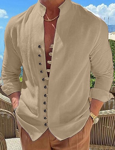 Pánské plátěná košile Letní košile Oblečení na pláž Košile pro volný čas Bez vzoru Dovolená Curise Bílá Modrá Hnědá Khaki Dlouhý rukáv Do V Jaro léto Oblečení