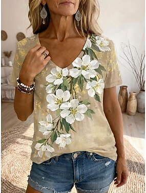 Dámské Tričko Tisk Květinový Grafika Rostliny Čechy Vinobraní stylové Krátký rukáv Do V Dlouhé topy Denní Vodní modrá Světlá růžová Fialová Trávová zelená Khaki Léto Jaro