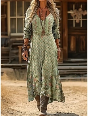 Dámské Dlouhé šaty Maxi šaty Volnočasové šaty Swingové šaty Letní šaty Boho šaty Vinobraní Dovolená Denní Plážové Běžný Květinový Dlouhý rukáv Do V Trávová zelená Léto