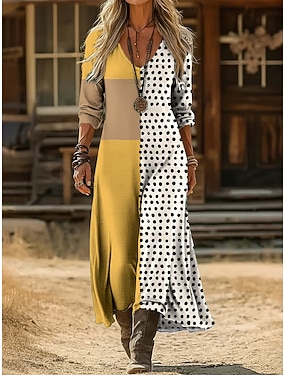 Dámské Maxi dlouhé šaty Vintage šaty Volnočasové šaty Vinobraní Denní Venkovní Dovolená Volný Geometrický Puntíky Dlouhý rukáv Do V Žlutá Jaro Podzim