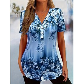 Dámské tričko květinové vintage volnočasové s krátkým rukávem V-výstřih běžné topy každodenní knoflíky tisk modrá růžová fialová zelená léto jaro