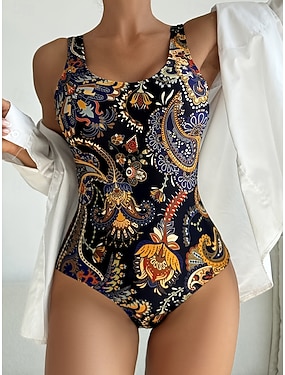 Dámské jednodílné plavky s efektem slim boho monokiny vysoký výstřih kontrola bříška vysoký pas slim bez zad elegantní dovolená paisley U-krk bez rukávů